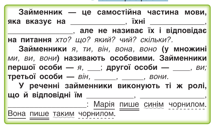 Прочитай, пригадавши пропущене. Відтвори з пам’яті третє речення.