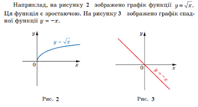 Функцію називають зростаючою на деякому проміжку, якщо кожному більшому значенню аргументу із цього проміжку відповідає більше значення функції.