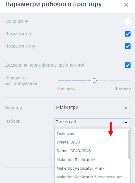 Щоб відредагувати сітку робочої поверхні, у правому нижньому куті натискають кнопку Редагувати Сітку (Edit Grid) та налаштовують одиницю вимірювання (можна перемикатися між дюймами та міліметрами), а також висоту та ширину сітки. Ця функція особливо зручна для тих, хто збирається друкувати створені моделі на 3D-принтері: можна задати сітці розміри друкованої поверхні принтера (крім осі Z), і тоді буде зрозуміло, якого розміру буде модель ще до друку.